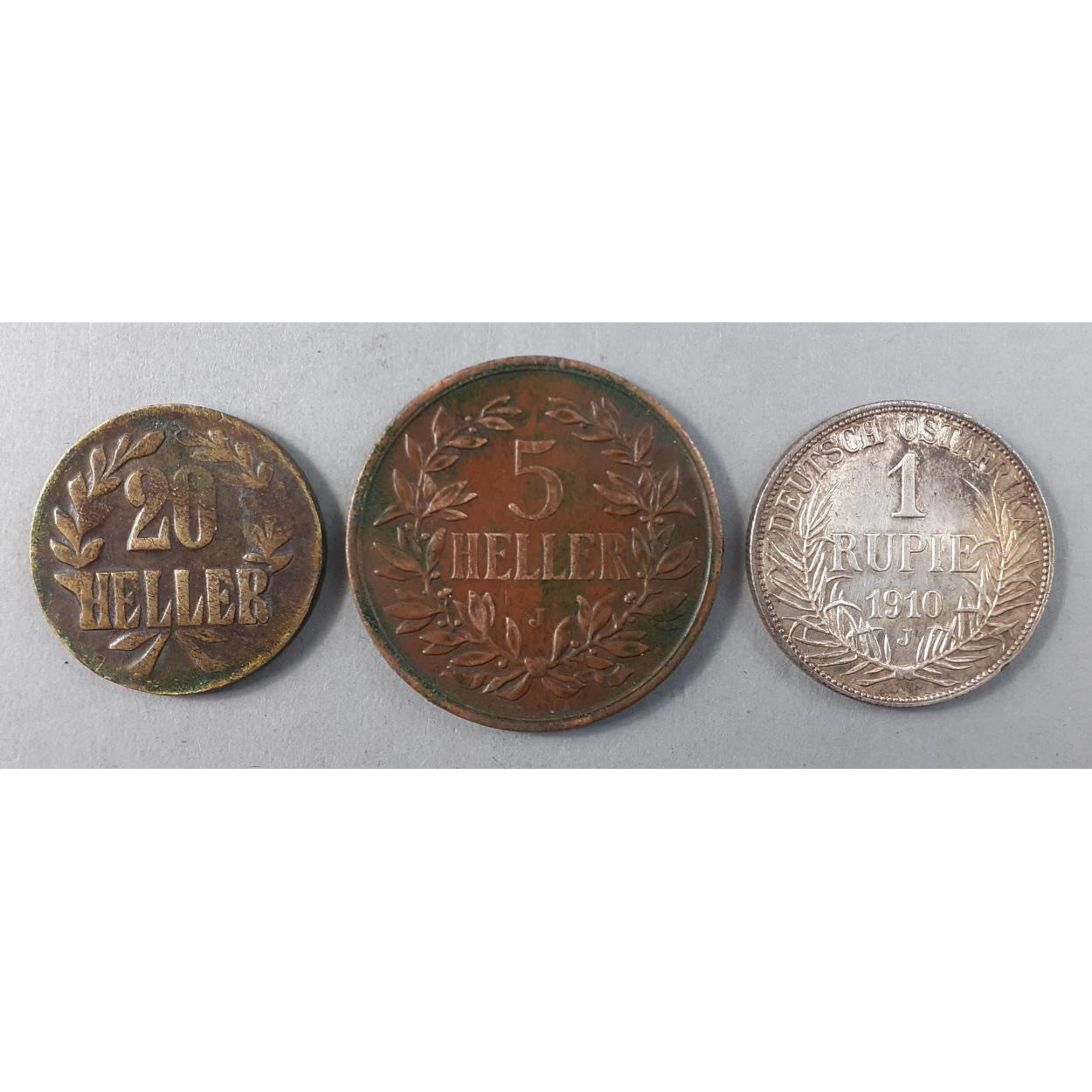 Three German East Africa coins of interest to include a 1910 silver Kaiser Wilhelm 1 rupie which has excellent eye appeal but does have light scratches visible particularly under magnification. A 1916 x 20 heller (with wear) and a 1908 x 5 heller (good collectable grade)