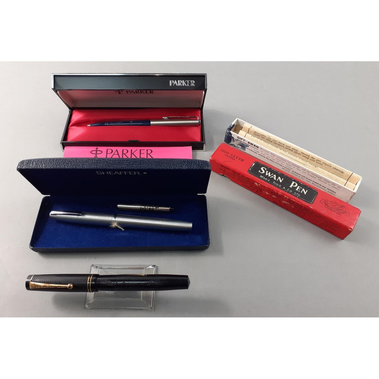 A nice collection of writing implements to include a SWAN MABIE TODD empty box with a STEPHENS Leverfil no 102 side lever in good used condition with a 14ct nib, a boxed PARKER 45 classic and a SCHAEFFER ball point pen in a box