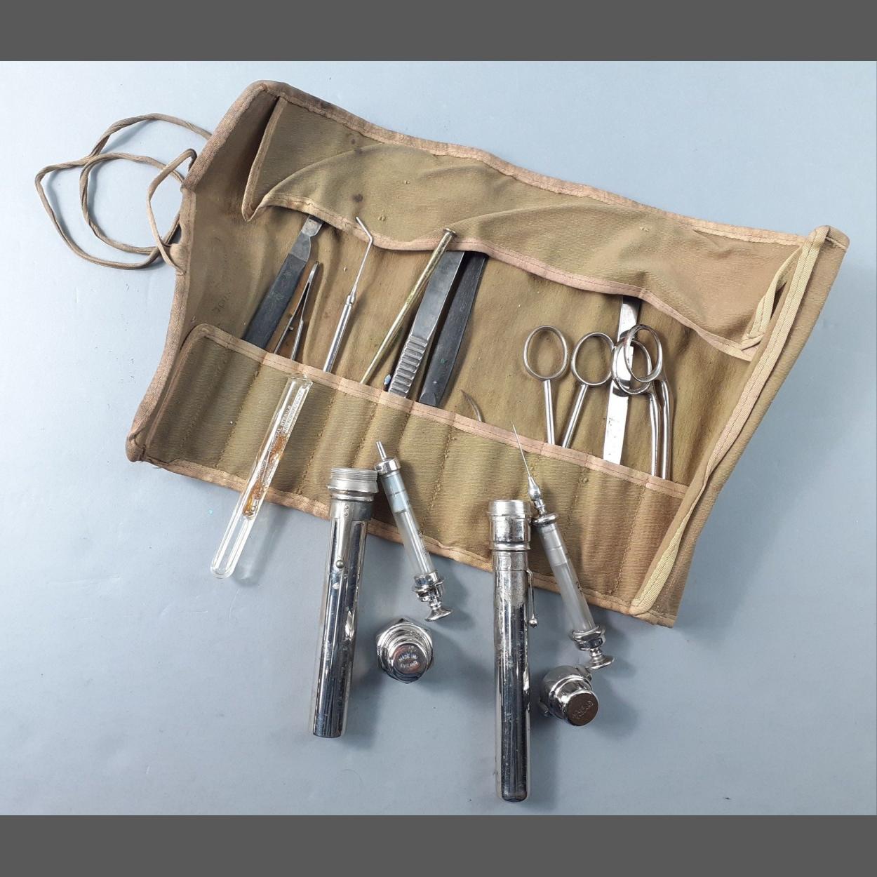 A small collection of medical interest to include a roll of medical instruments, aluminium cased syringes and a glass vial of sutures