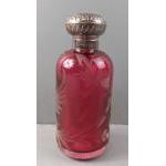 A beautiful cranberry glass bottle with heavily etched floral design retaining internal glass stopper and with silver top hallmarked for Birmingham 2002, maker's mark The Original Perfume Bottle Co Ltd