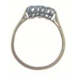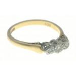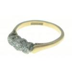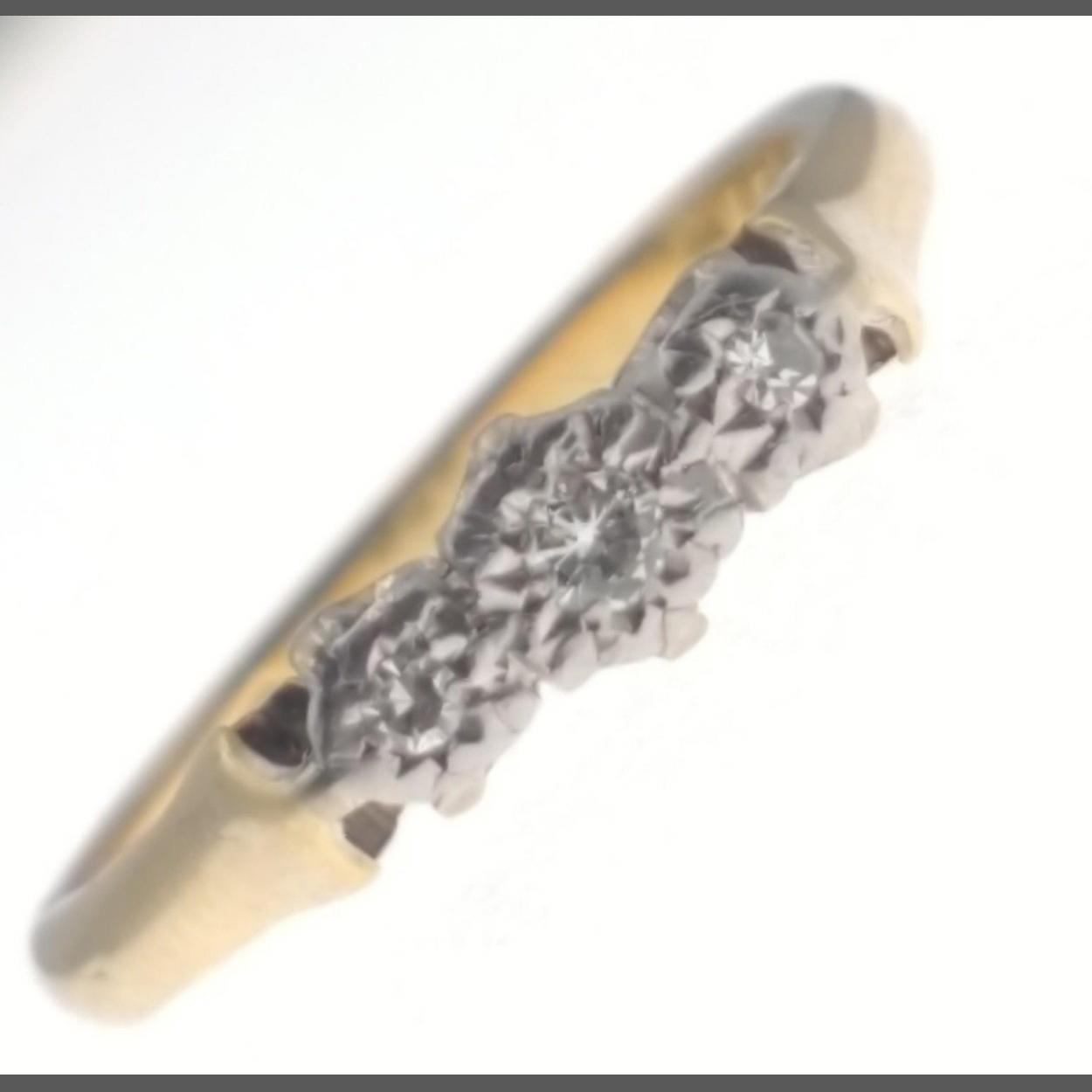 A TRIO OF DIAMONDS 18c stamped ring - ring size L - three diamonds (tested) middle diamond dimension 3mm approx diameter - gross weight 2.76g approx