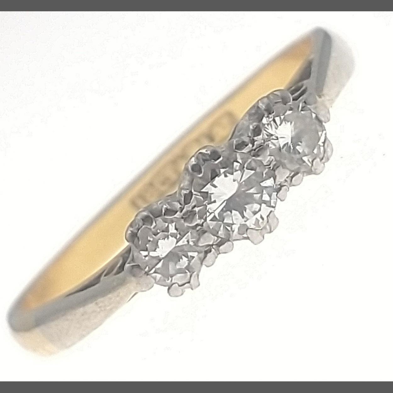 A TRIO OF DIAMONDS 18c stamped ring size P/Q - three diamonds (tested) all three diamonds dimension 3mm approx diameter - gross weight 2.60g approx