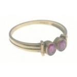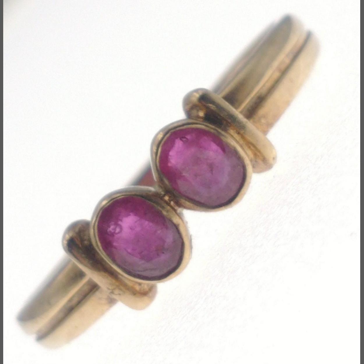 A 375 stamped yellow gold ring with double oval shaped garnet stones, 4mm in length and 3mm width approx, size P/Q, gross weight 1.51g approx