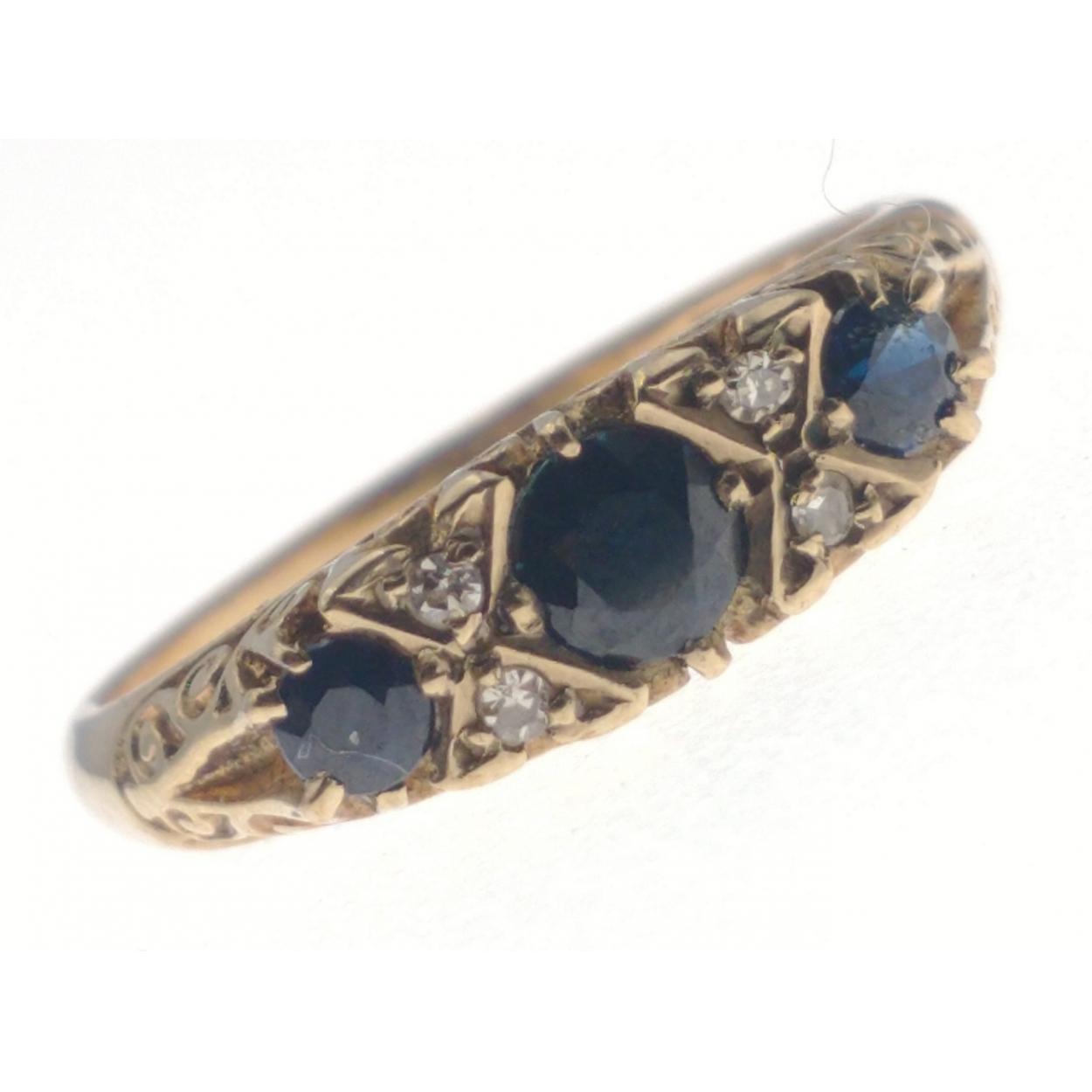 A 9ct stamped yellow gold diamond (tested) and sapphire ring, central sapphire measures 4mm approx, size N, gross weight 2.55g approx