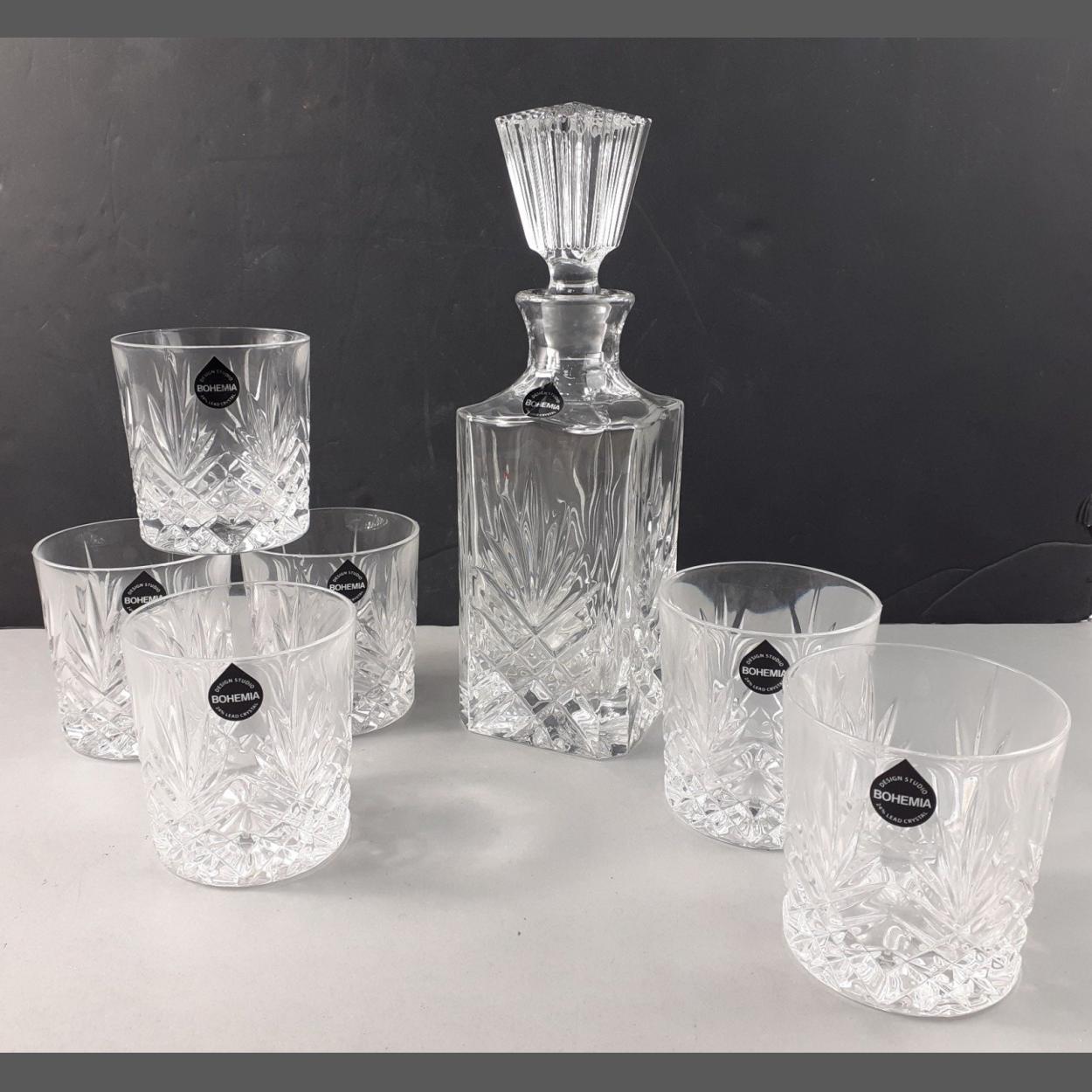 A BOHEMIAN crystal decanter (27cm tall) and 6 matching whisky tumblers. Each item retains its label and all in excellent condition