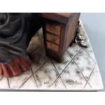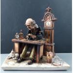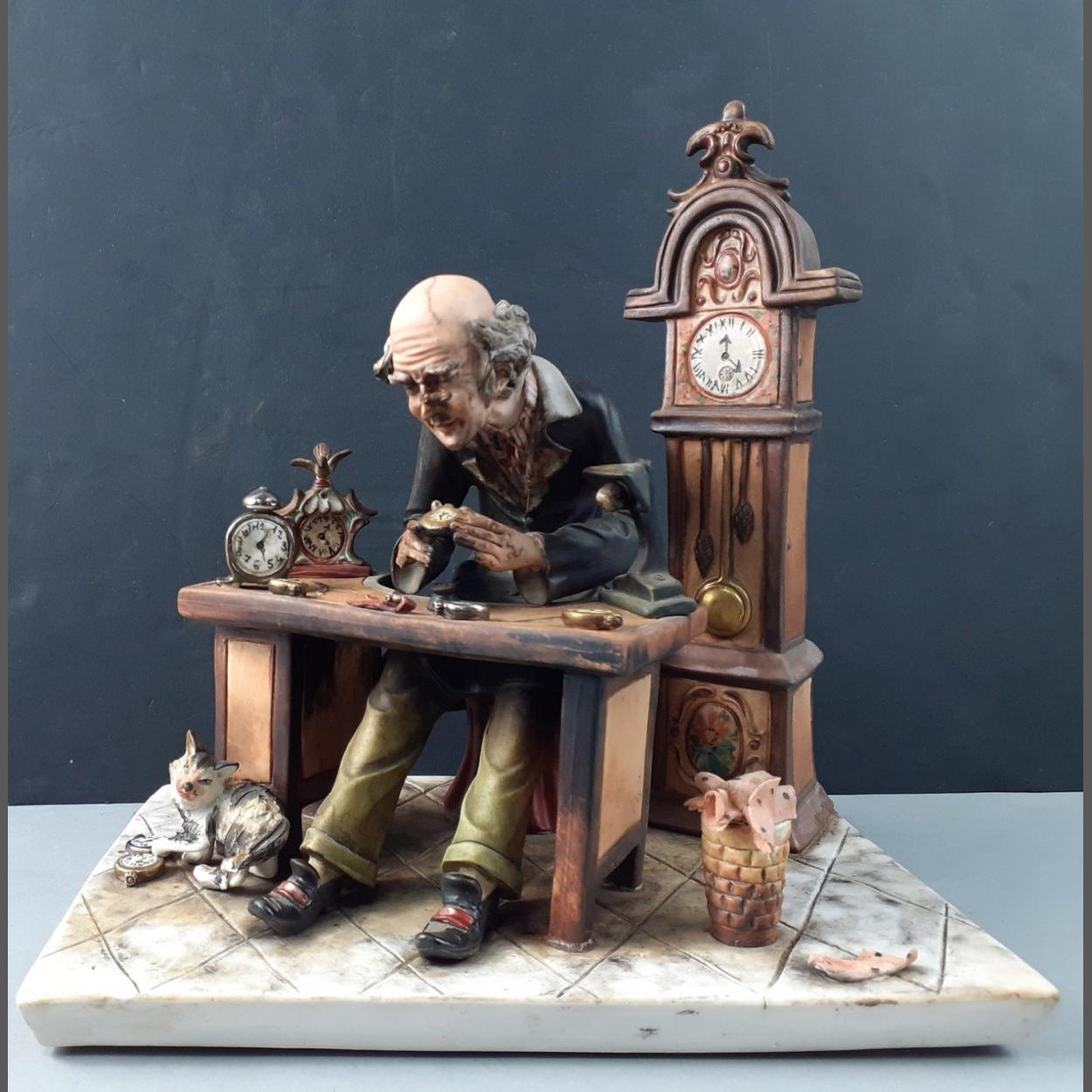 A charming figurine of an old watchmaker with cat by CAPODIMONTE, modelled by CORLESE, number 357 clock stands 25cm high, figure 23cm across approx
