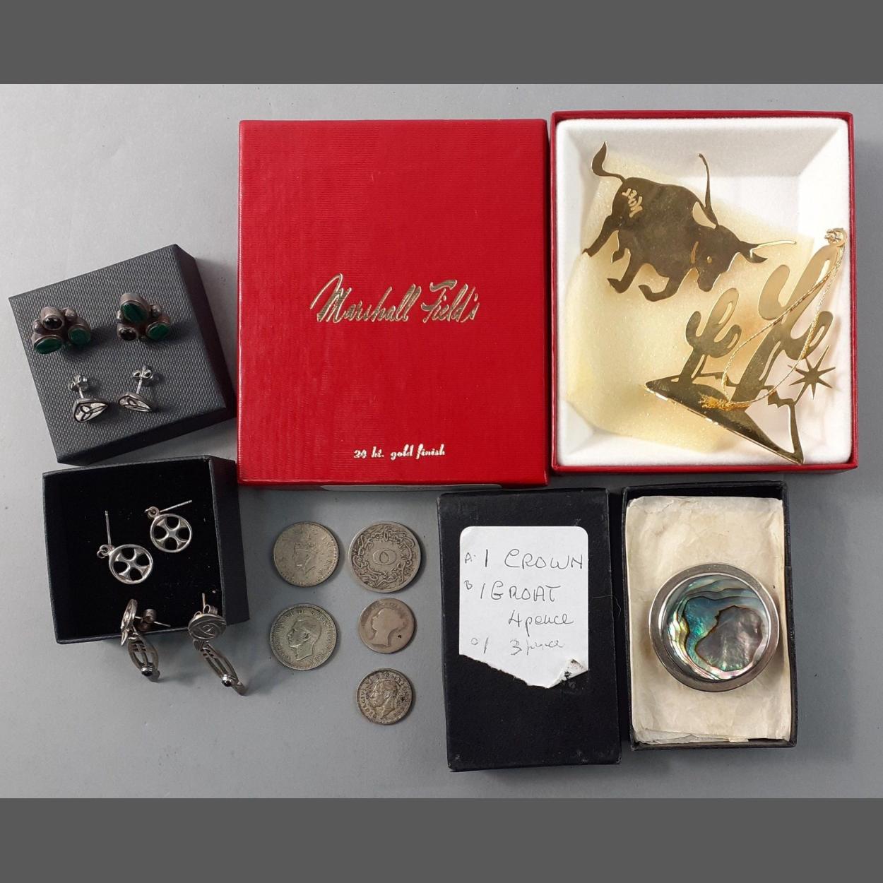 A small silver lot to include 5 coins, 4 pairs of earrings, a brooch, total gross weight 36.55g approx, plus a MARSHALL FIELD'S 24kt gold finish Texas longhorn and cactus Christmas decorations.