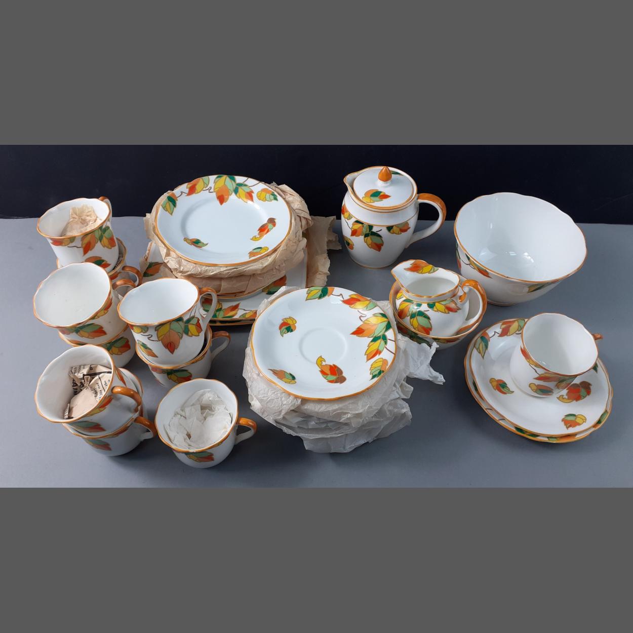 c1930's small FOLEY coffee set to include 2 sandwich plates, 11 small side plates, 11 saucers, 10 coffee cans, small sugar and cream and large sugar and milk. All appears to be in good condition