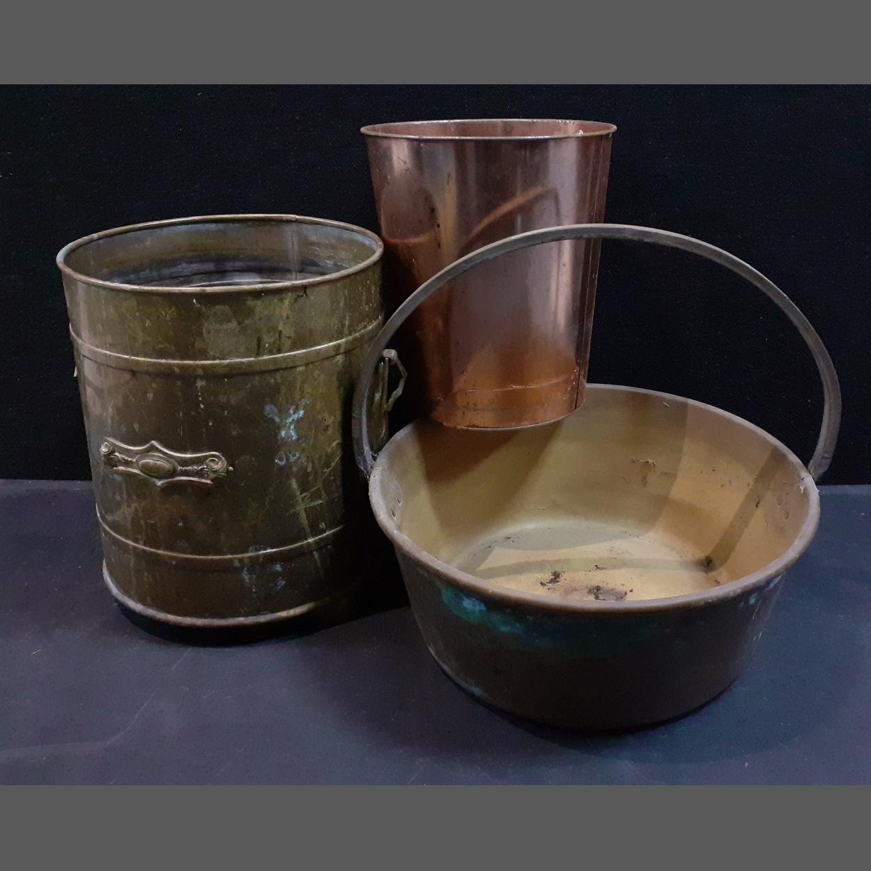 A brass jelly pan 36cm dia, 2 bins (one brass 27cm dia, 29cm tall),