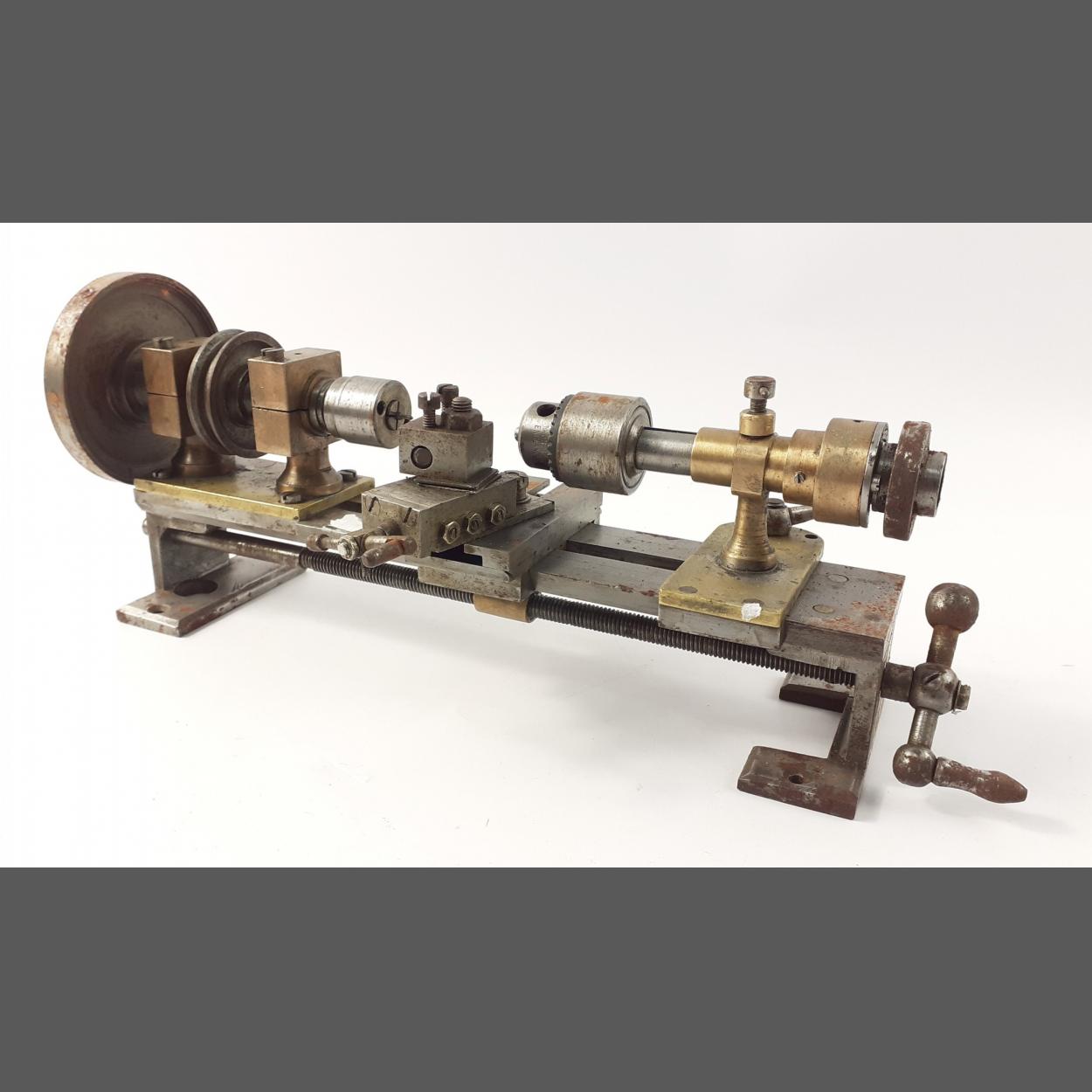 A watchmaker's desk top lathe, with some surface rust but in generally good condition 30cm long approx.