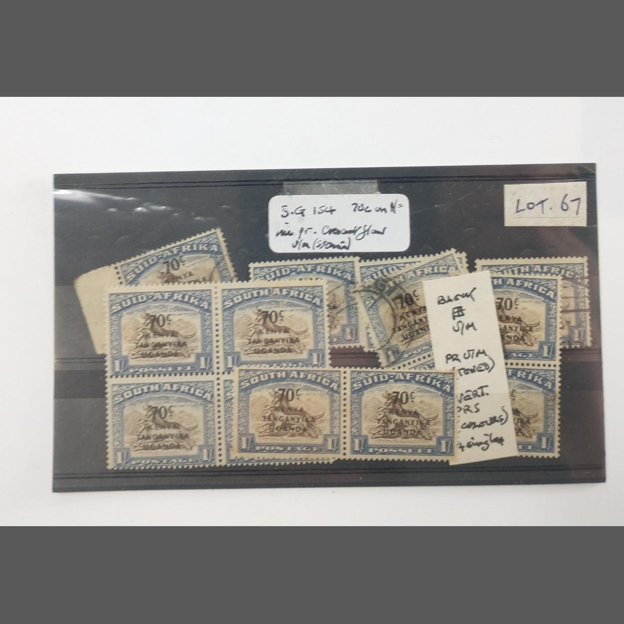 STAMPS South Africa KUT overprint 1927 one shilling blue & brown SG36 Mint block of four with gum, plus a similar pair and other cancelled examples. Interesting stamps