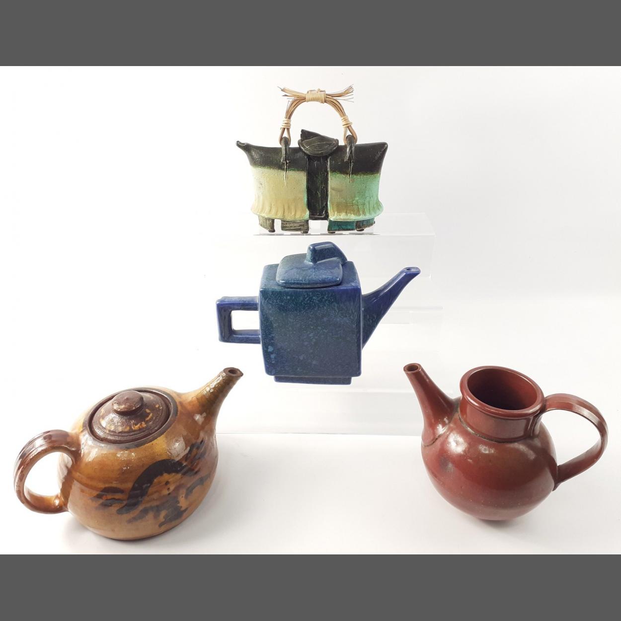 Lovely collection of four art pottery teapots. Very attractive and unusual pieces. One lid broken.