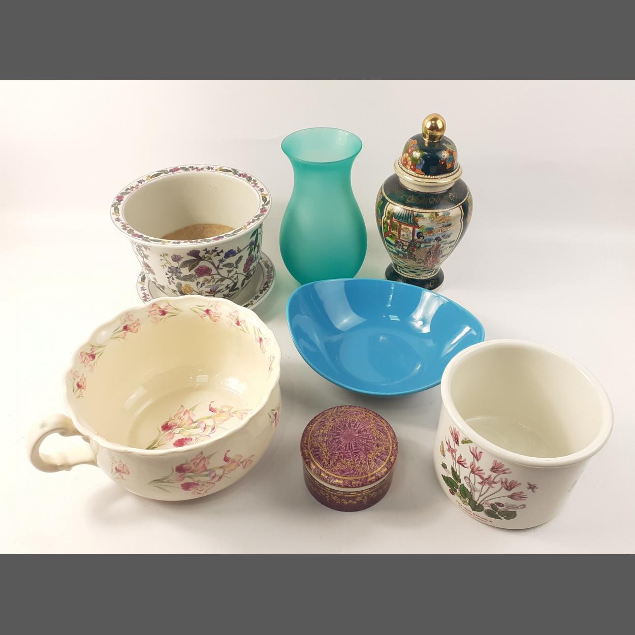 A quality mixed box of ceramics to include a pretty ceramic chamberpot decorated with irises (22cm dia), also a ROYAL WORCESTER fine bone china lidded trinket box in lilac with gilt trim (10cm dia), a PORTMEIRION Botanic Gardens pattern cyclamen plant pot H12 x Diameter 16cm, a KEWDOS hand-made and painted porcelain plant pot and saucer 20 dia and H15cm, and a medium sized ginger jar showing traditional Chinese scenes (24cm high) etc