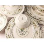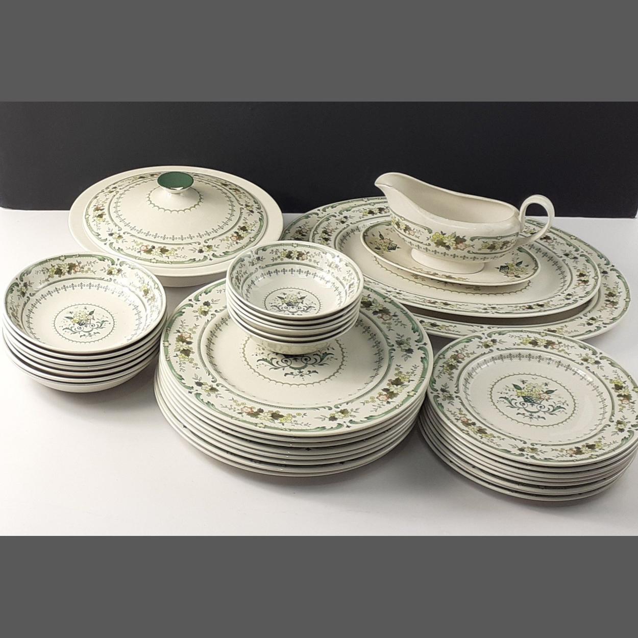 Wonderful Royal Doulton Provencal part dinner service to include 8 x 27cm plates, 8 x 20cm side plates, 7 x 17cm bowls, 6 x 14cm bowls, a large 40cm platter, 1 x 33cm platter and a 26cm tureen with a chipped handle, sauce boat dish.