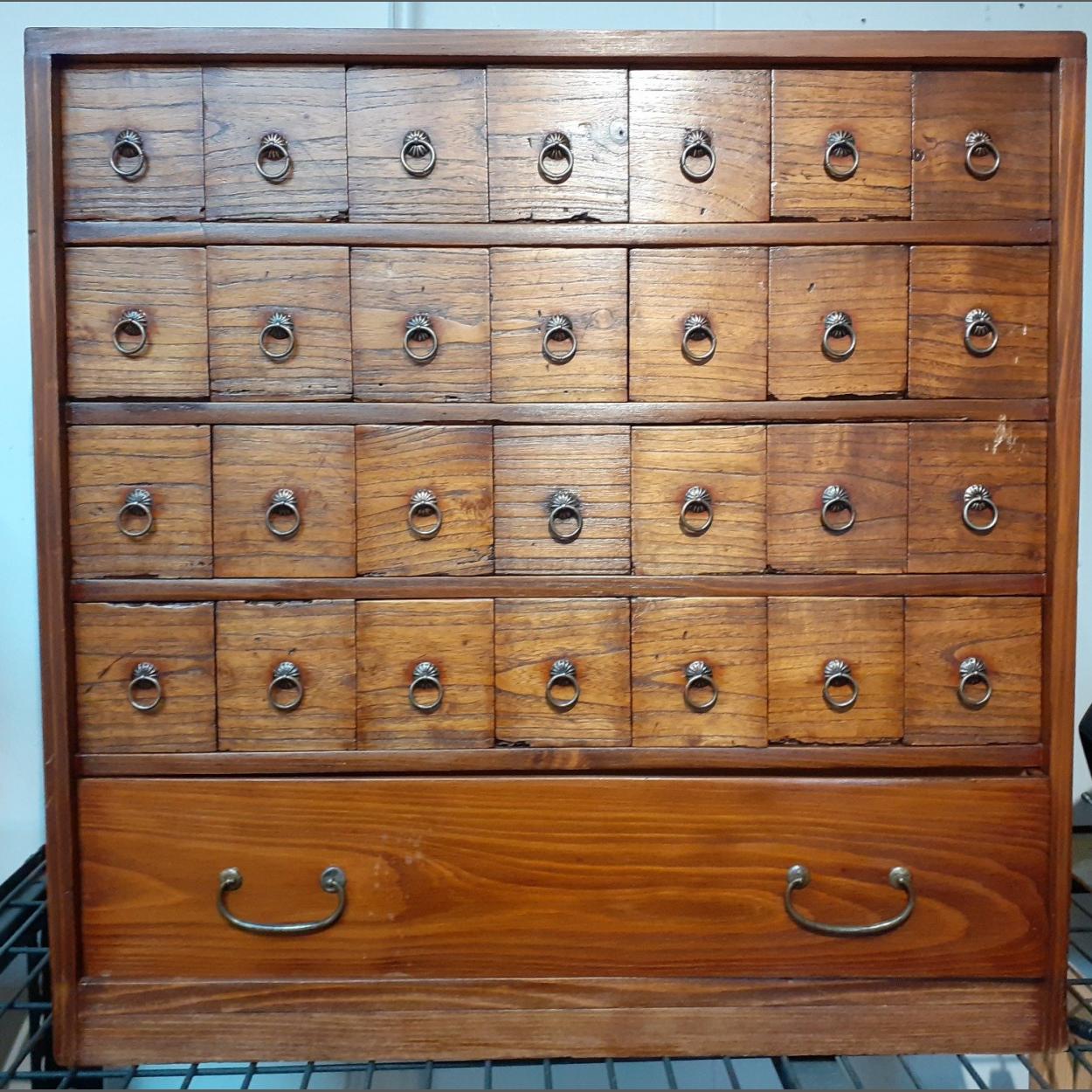 A KUSURI DANA multi-drawered herbs/medicine chest constructed from kiri and sugi wood circa 1900, 28 small drawers in total plus 1 large drawer below. H60xW60xD20cm approx. Complete with a certificate of authenticity from Tansu Japanese antique furniture, purchased 1999 for £1295. Some wear and water stains to top. Bottom drawer is possibly a later replacement