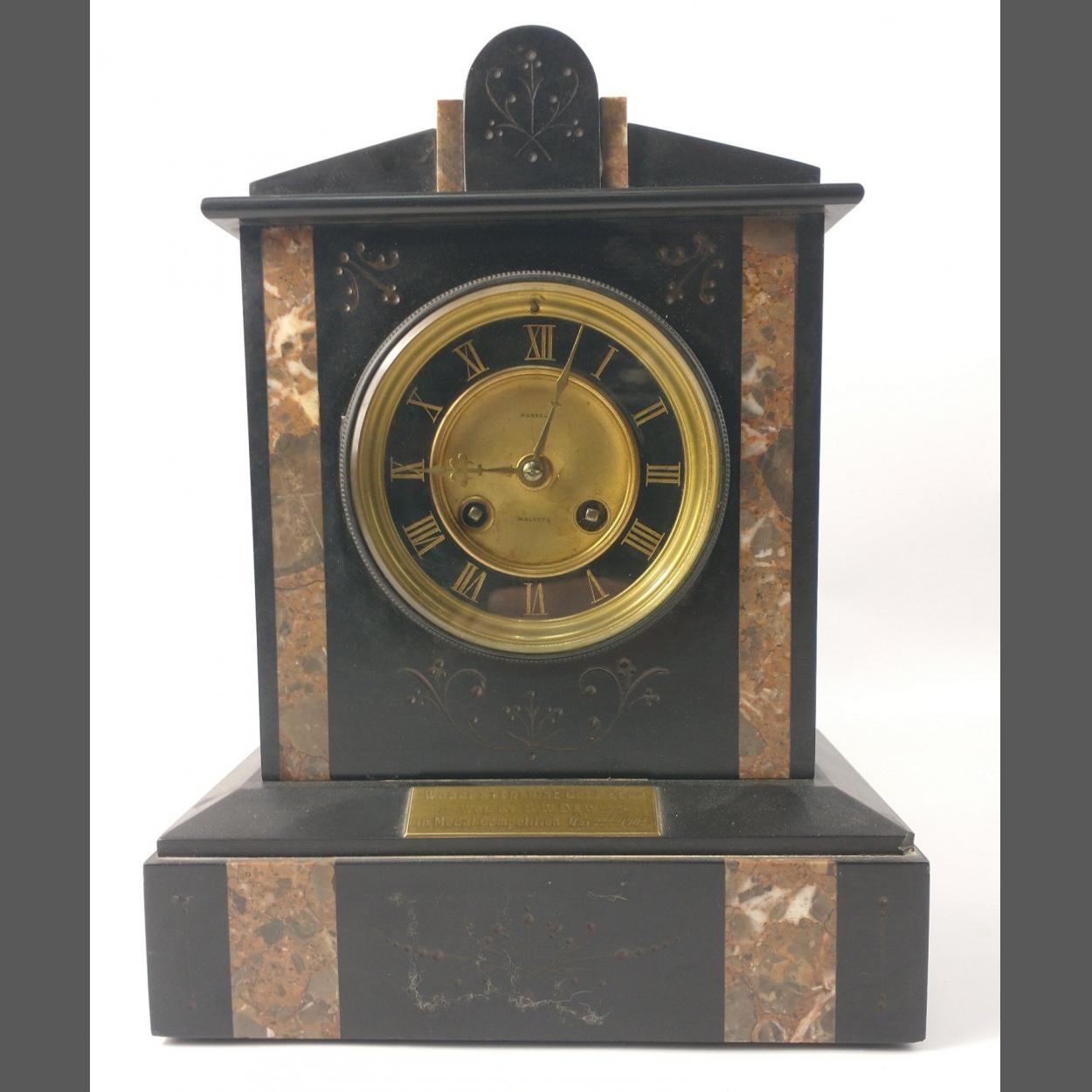 A beautiful and substantial marble mantel clock, with Russell of Malvern stamped to the face and Worcestershire golf club brass plaque dated 1902.