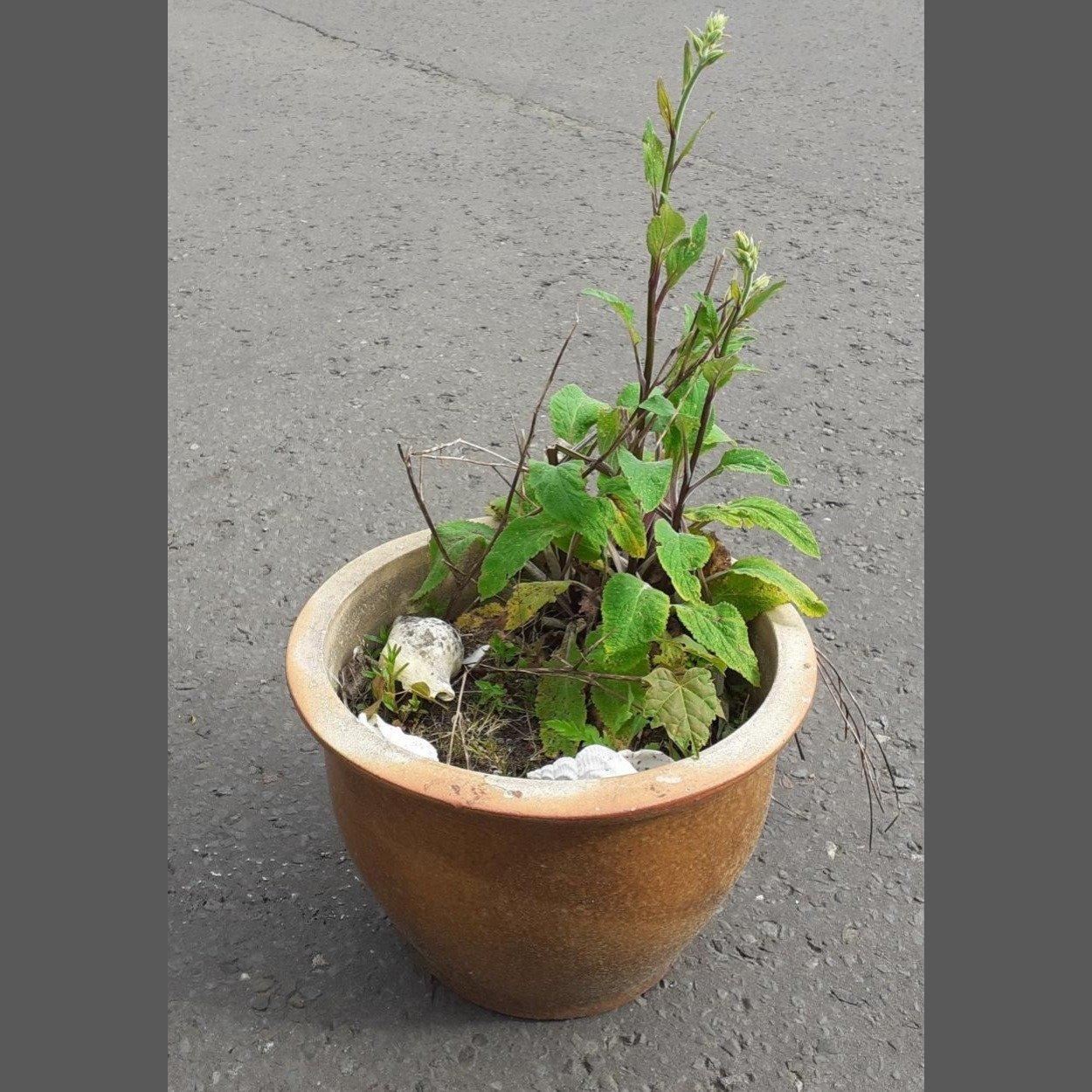 A ceramic garden planter with planting and sea shells included - diameter 30cm approx
