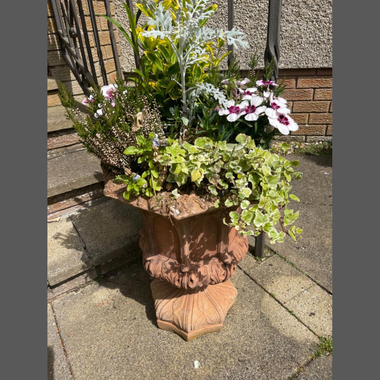 Antique urn style terracotta planter standing 50cm high with plants. A very attractive and classy looking piece.