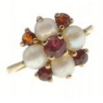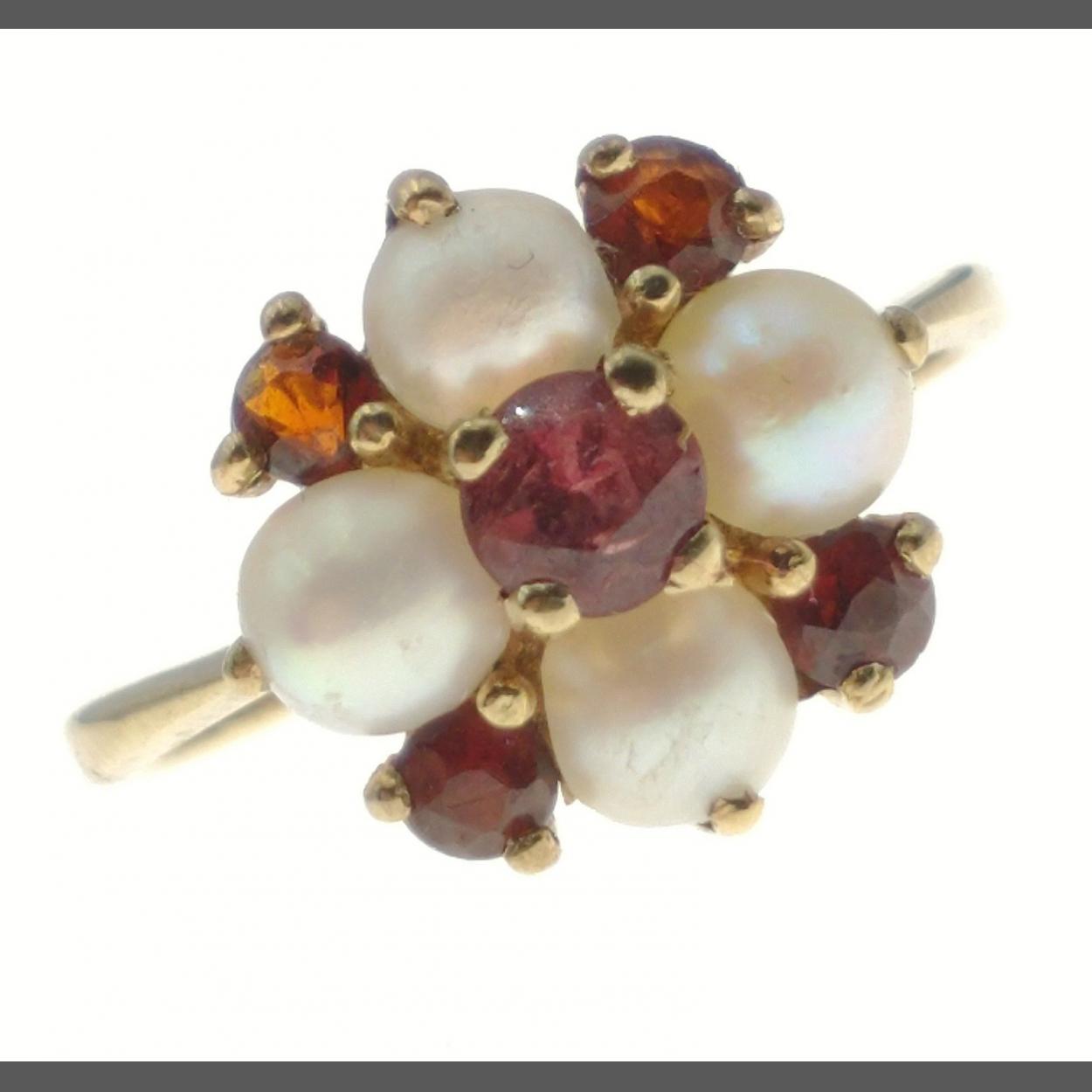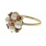 A QUALITY yellow metal ring stamped with maker's mark (for info does not react with the magnet) with pearl and garnet setting, gross weight 1.90g approx