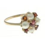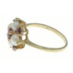 A QUALITY yellow metal ring stamped with maker's mark (for info does not react with the magnet) with pearl and garnet setting, gross weight 1.90g approx