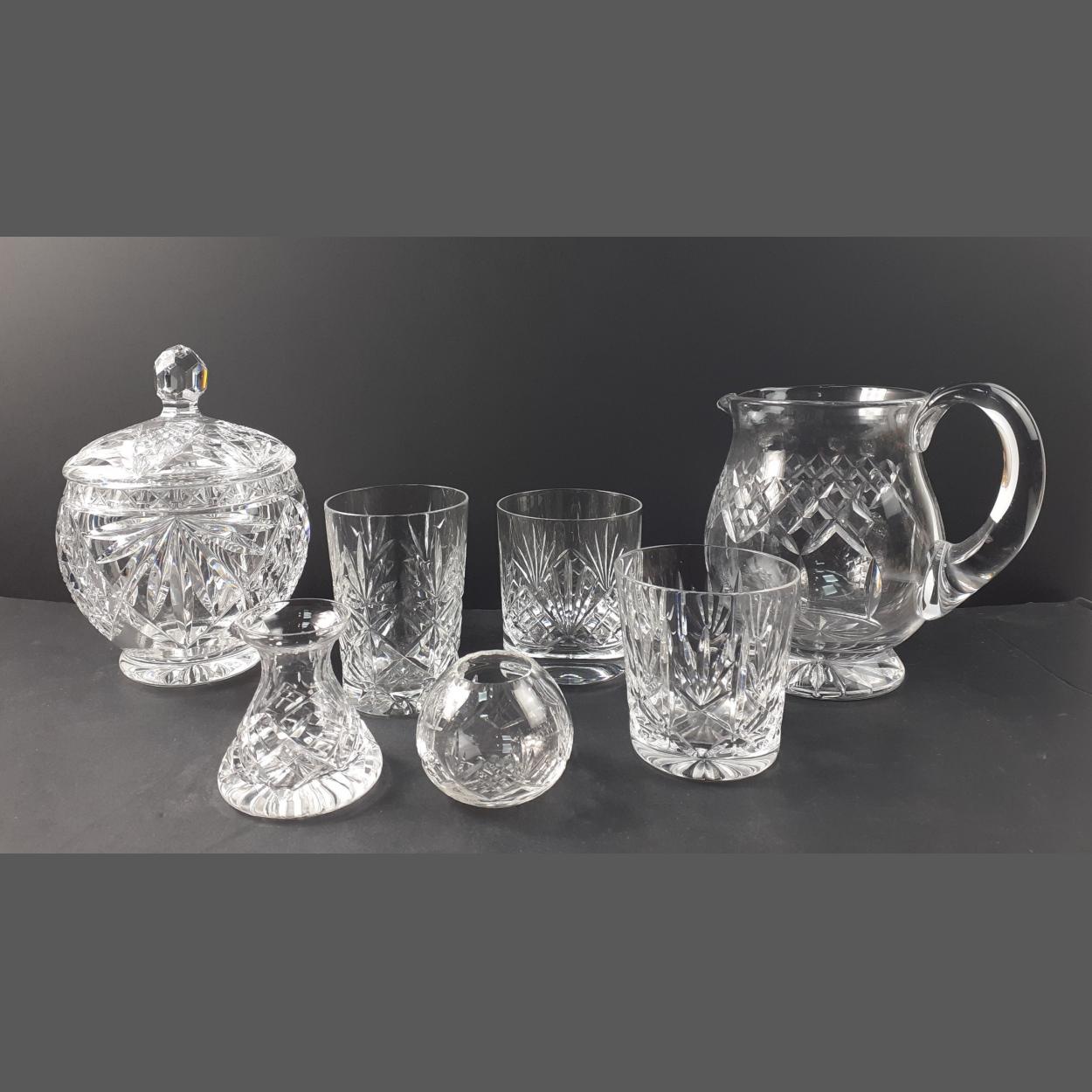 A small crystal glassware collection to include a lovely biscuit barrel, jug, three whisky tumblers and others.