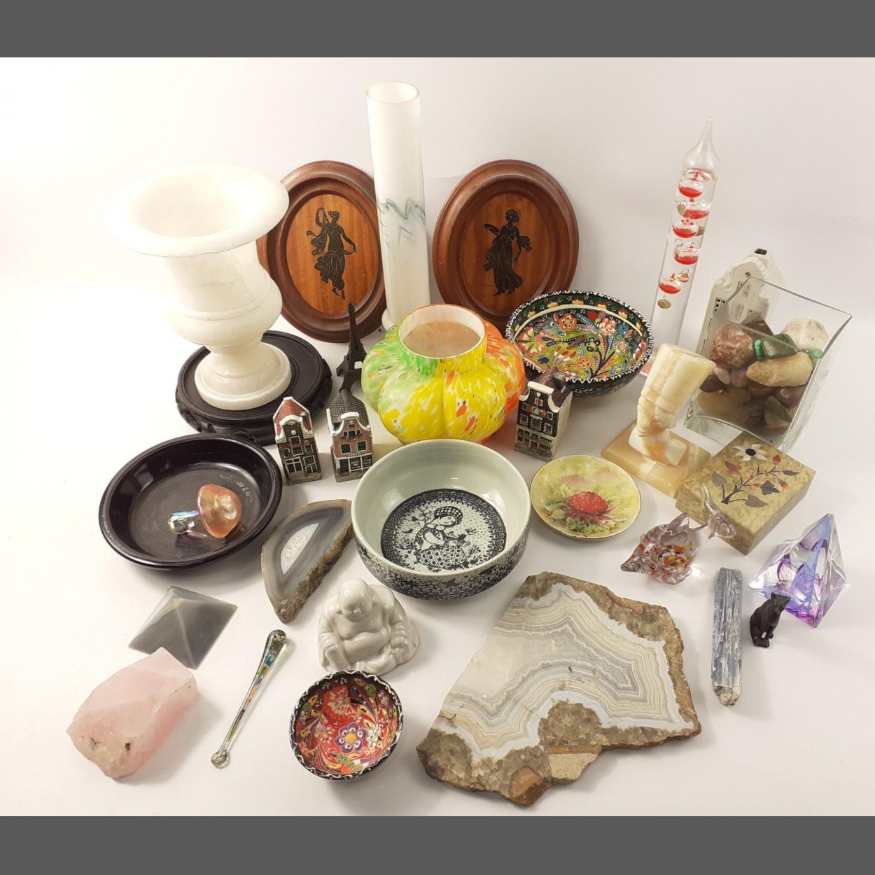 Mixed decorative lot to include various ceramic bowls, including one by Nymolle, ceramic Buddha, onyx Pharoah's head, glass thermometer, small glass mushroom, onyx urn and other decorative items.