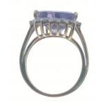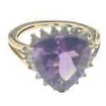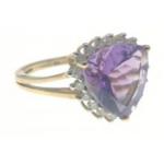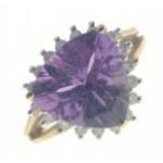 A gold ring hallmarked 9K with a trillion cut central amethyst surrounded by 18 small diamonds (tested), size J, gross weight 2.8g approx