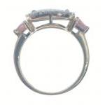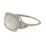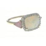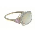 A 9ct opal (10mm approx) ring surrounded by diamond chips and 2 trillion cut pink stones on the shoulders, size K, gross weight 1.8g approx