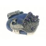 A silver pendant stamped 925 TGGC with a silver peacock with purple stones in his tail encapsulating a large blue stone 5cm length approx