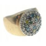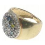 A faintly stamped 375 gold ring with a pretty cluster of coloured stones including 3 diamonds with a surrounding band of 20 small diamonds (tested), size F, gross weight 2.9g approx