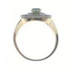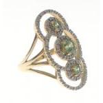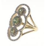 A stunning 585 stamped gold ring set with 3 peridots and circlets of small diamonds (30mm long), size N, gross weight 5.5g approx