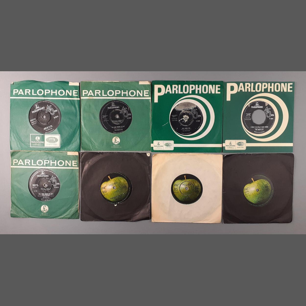 Eight good BEATLES singles to include Let It Be, Hey Jude, I Want To Hold Your Hand, She Loves You, Daytripper, From Me to You, All You Need is Love, Ballad of John and Yoko. All with wear.