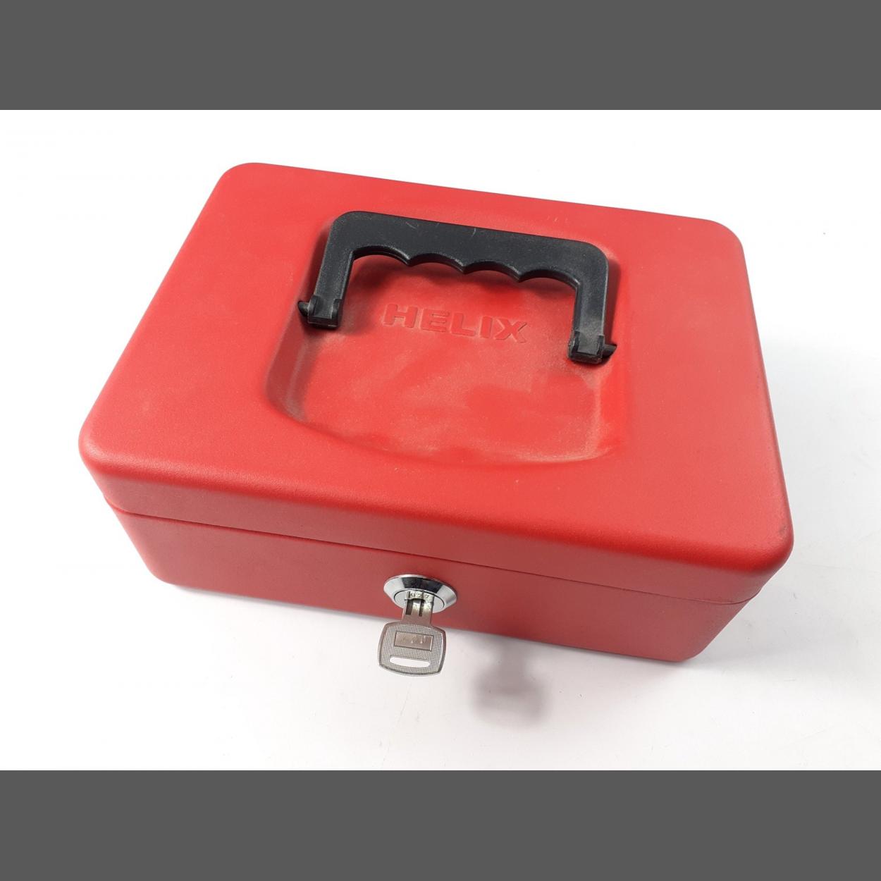 A red HELIX lockable money box with original key and interior tray, 20x15cm approx