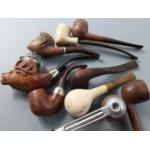 A collection of pipes including 2 clay pipes, 1 Old Bruyere, a French briar pipe, a silver hallmarked Peterson's pipe, and a Falcon