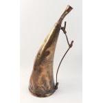 INTERESTING! A large ANTIQUE solid decorative copper drinking vessel with decoration and an unusual cross at the spout - a few dents but otherwise intact - dimensions 43cm tall approx
