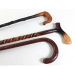 A VINTAGE & RARE HAWTHORNE wood nobbly walking stick with a shepherd crook form handle with two other wooden walking sticks