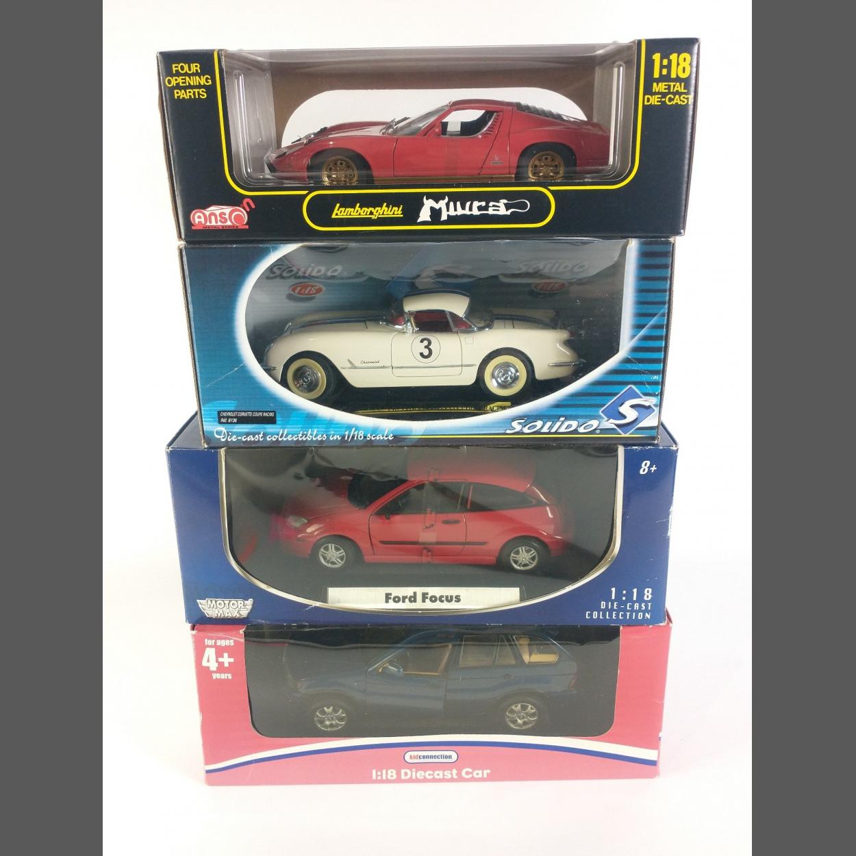 Four 1:18 scale MAISTO diecast models to include a Kid Cast RANGE ROVER, MotorMax FORD FOCUS, Anson LAMBORGHINI MUARA, Solido CHEVY CORVETTE