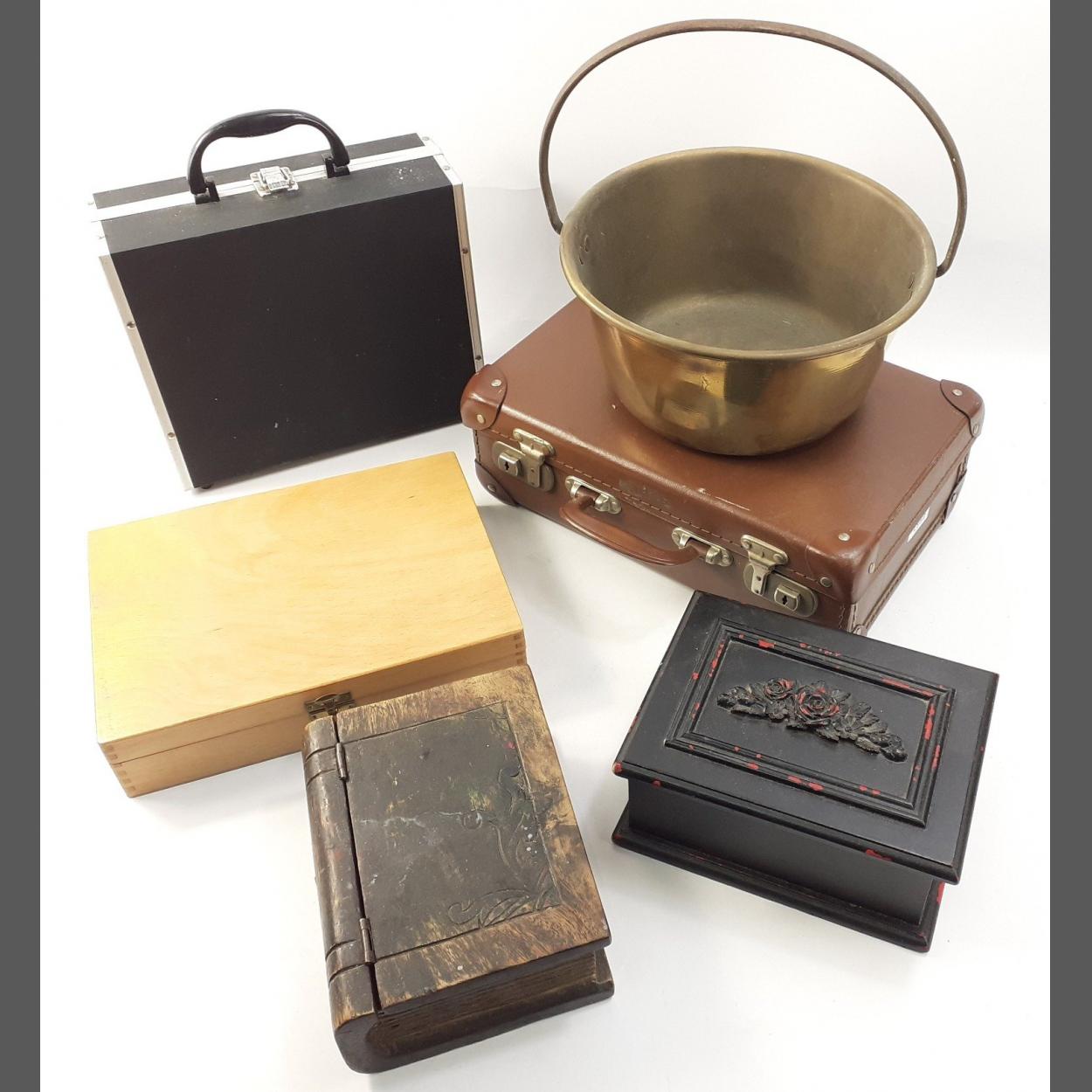 A small mixed lot to include 2 black wooden boxes, one styled like a book, (20x15x7cm), a vintage small suitcase, a wooden box, a hard sided camera case with no lining and a brass JEELY PAN