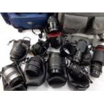 A PENTAX ME F 35mm camera with an SMC Pentax-M 1:1.7 50mm lens with 2 custom camera lens bags with contents to include VIVITAR macro focusing zoom (77362330) 70-210mm, CEN TON MC auto zoom 28-70mm lens, a SIGMA mini-wide 1:2.8 lens, PENTAX 28-20, a SIGMA UC APO 70-210mm lens, SMC PENTAX-A 1:2.8mm, SMC PENTAX-M 1:3.5mm, SIGMA UC zoom 28-70mm, SIGMA zoom 24070mm plus flash units, 2 padded pouches with colour film filters, etc