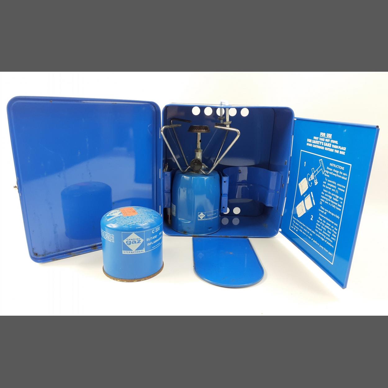 A GAZ branded de luxe camping gas stove in its tin with a spare camping gas cannister