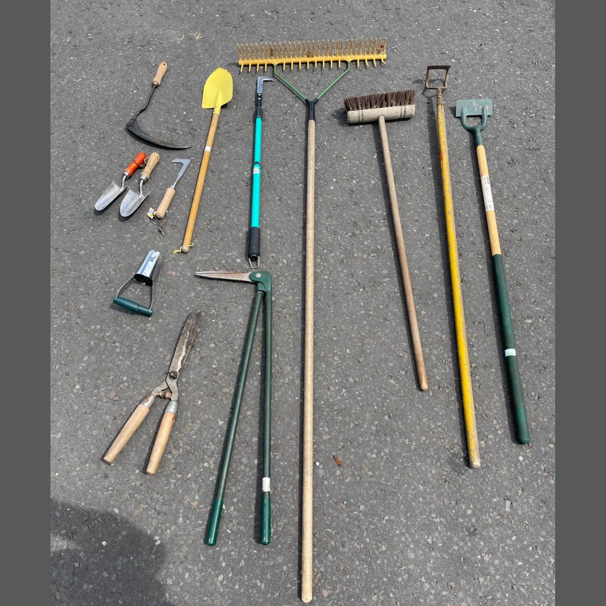 A collection of garden tools to include a rake, scythe, hoes, shears etc etc