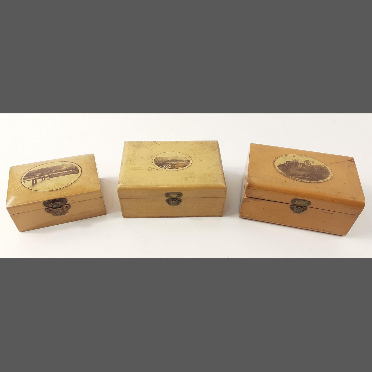 Three small MAUCHLINE WARE boxes with pictures of the Windings of the Forth and Abbey Craig, Stirling Castle from the King's Knoll and Railway Bridge and Barnhill, Perth
