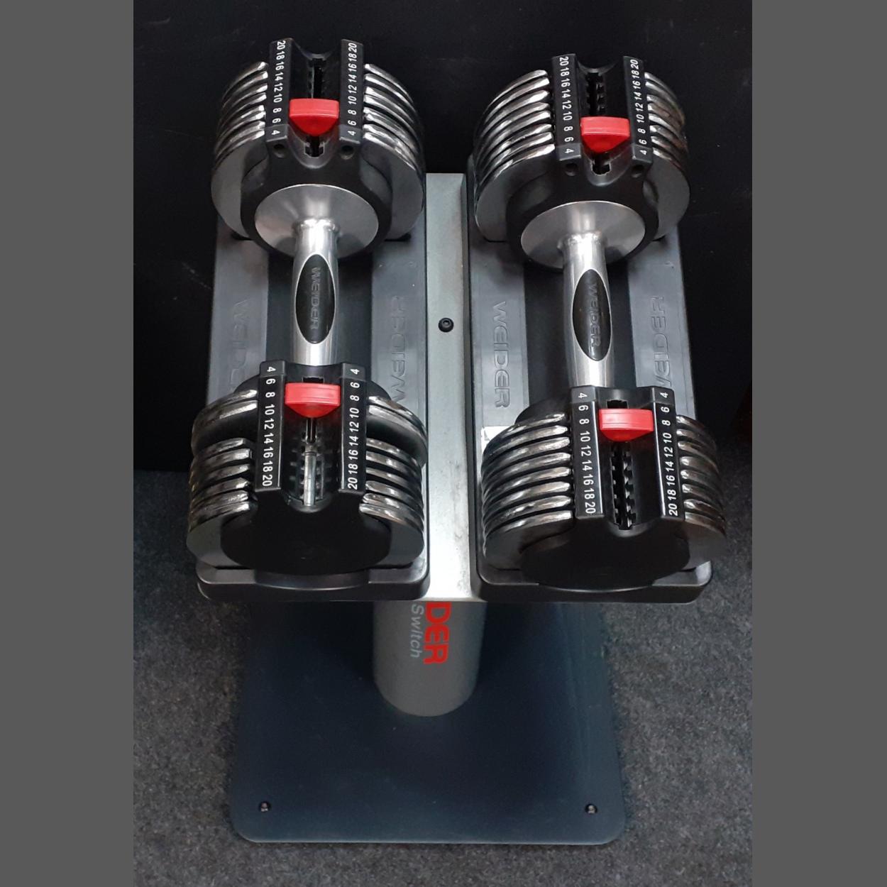 Two WEIDER power switch dumbbell sets on a stand