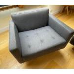 A modern grey fabric three piece suite to include a two seater couch and two matching armchairs. In good condition.