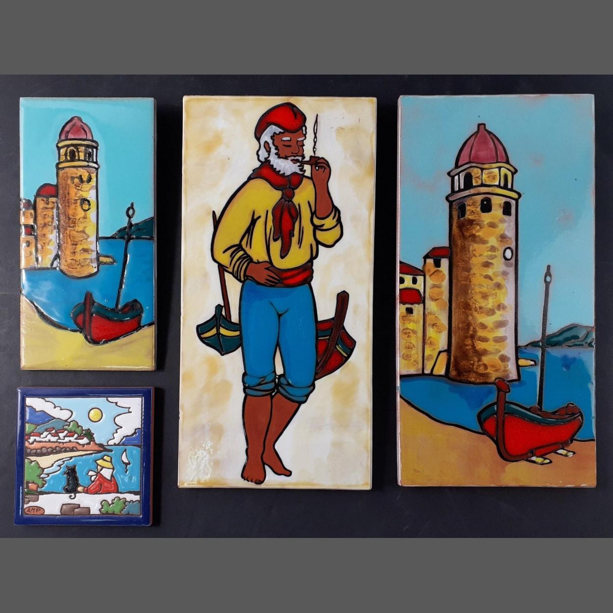 Four pretty decorative tiles - 2 tiles, 8.5 cm x 4cm one with a fisherman smoking his pipe, the other with a seaside scene, 2 smaller tiles,1 x seaside scene, cute cat and lady scene.