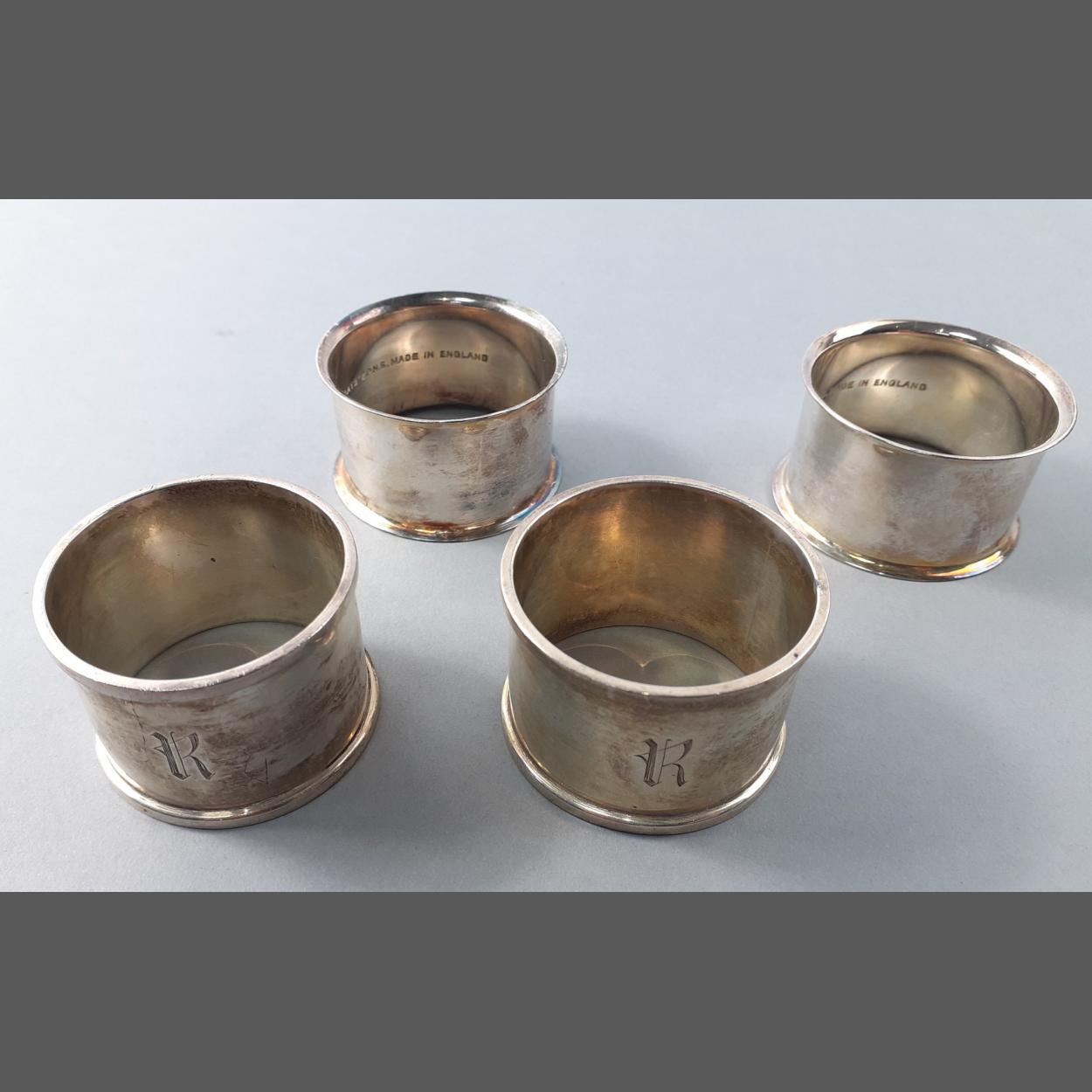 Two Yeoman plated EPNS napkin rings and 2 silver plated napkin rings each engraved with the letter R. Total weight 58.29g approx.