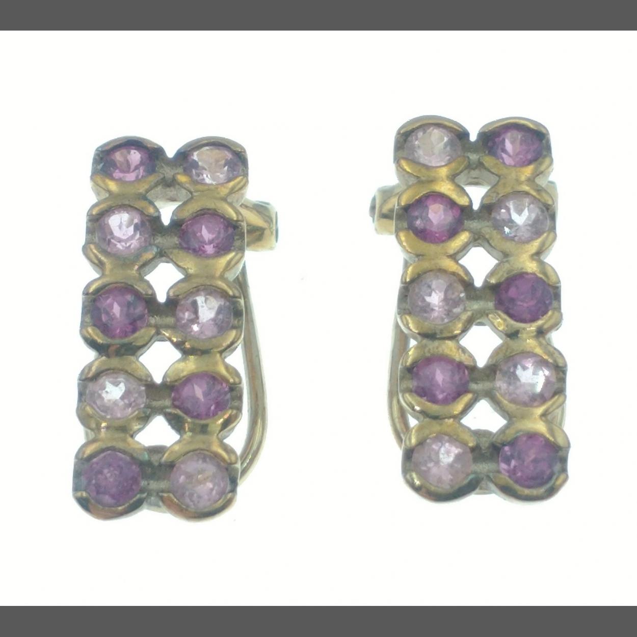 Fully hallmarked 375 clip-on gold earrings set with purple and clear stones each 15mm long, gross weight 3.6g approx