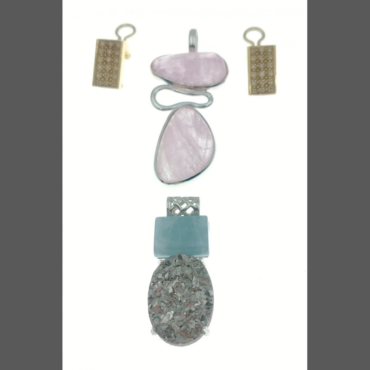 A large 925 double pink hard stone pendant, 50mm long (crack to top stone) and also a 925 hard stone pendant (40mm approx) and a pair of unmarked clip earrigs