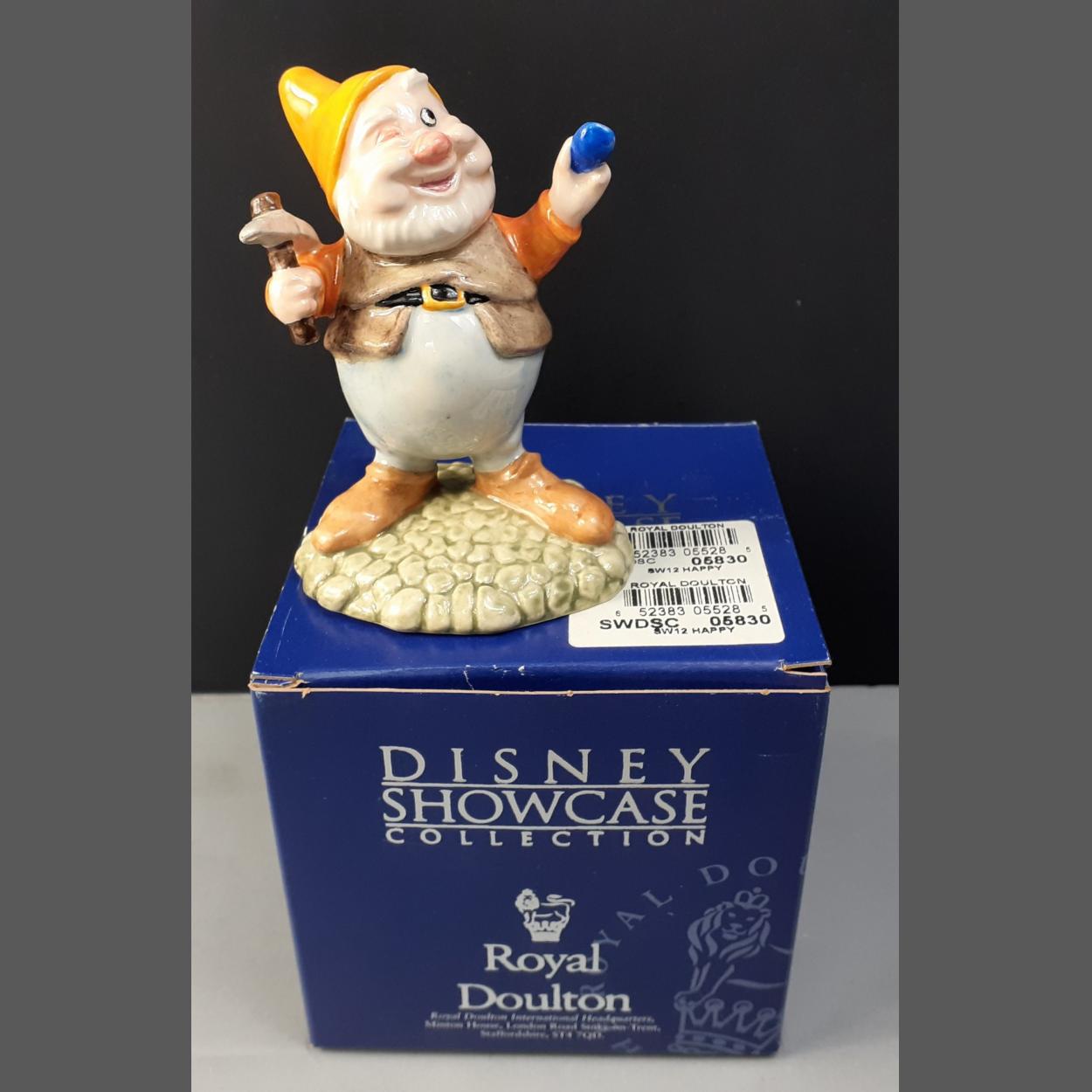 ROYAL DOULTON DISNEY SHOWCASE Snow White HAPPY pottery figurine still in original box and in good condition with no cracks, damage repair or chips noted - dimension height 9cm approx