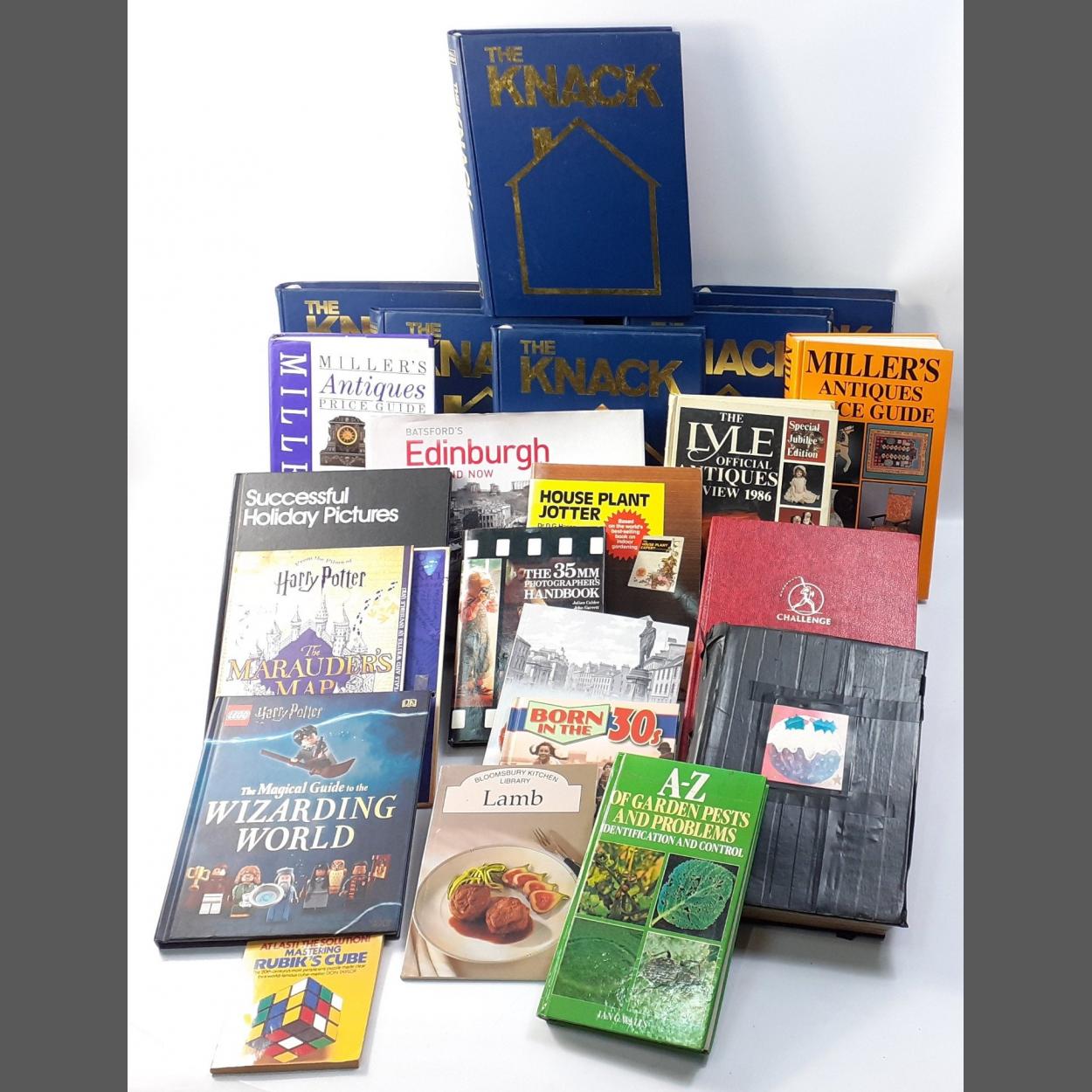 A box FULL of books to include what looks like the full collection of Home DIY 'THE KNACK' in albums plus also Batsfords Edinburgh Then And Now, The 35mm Photographers Handbook book, The A-Z of Garden Pests and Problems, Mastering The Rubik's Cube, Born In The 30s, The House Plant Jotter by DG Hessayon, Dixons Successful Holiday Pictures, Leith Through Time, Harry Potter The Maurauder's Map A guide to Hogwarts, LEGO Harry Potter The Magical Guide to the WIZARDING WORLD